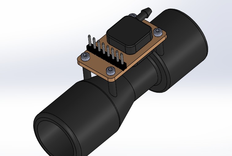 O projeto tem como objetivo desenvolver um sensor de fluxo de massa para utilização em sistemas de monitoramento de parâmetros ventilatórios. O sensor de fluxo deve ser bidirecional, ou seja medir o fluxo inspirado e expirado, além de também medir a pressão na porta de conexão do paciente. O sensor deve permitir os procedimentos de limpeza e esterilização. A Figura 2 mostra um exemplo do sensor a ser nacionalizado. Já a Figura 1, mostra uma representação 3D da proposta do sensor a ser desenvolvido. O sensor consiste em um tubo de Bernoulli com leitura da pressão diferencial através de sensor eletrônico, circuitos de condicionamento de sinal e interface de comunicação.
